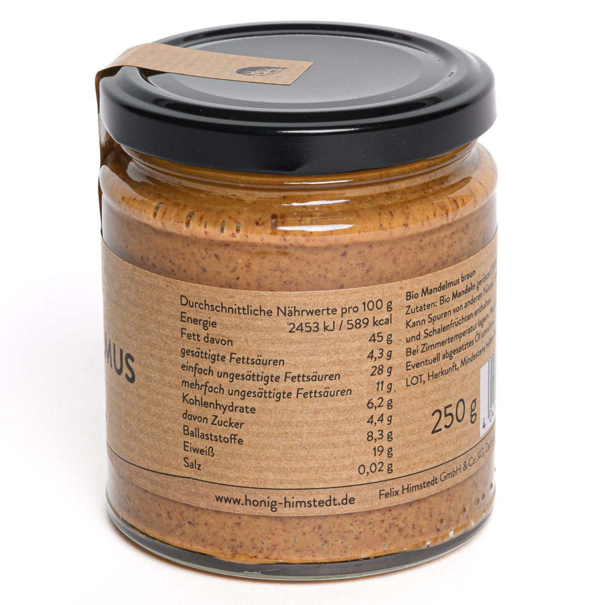 Unser braunes Bio Mandelmus überzeugt mit seinem intensiven, nussigen Aroma und wird aus ungeschälten Mandeln schonend geröstet und verarbeitet – ganz ohne Zusatzstoffe. Ein echtes Naturprodukt für